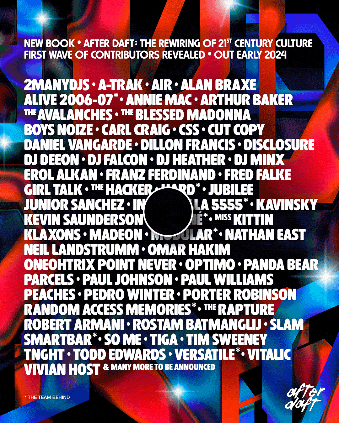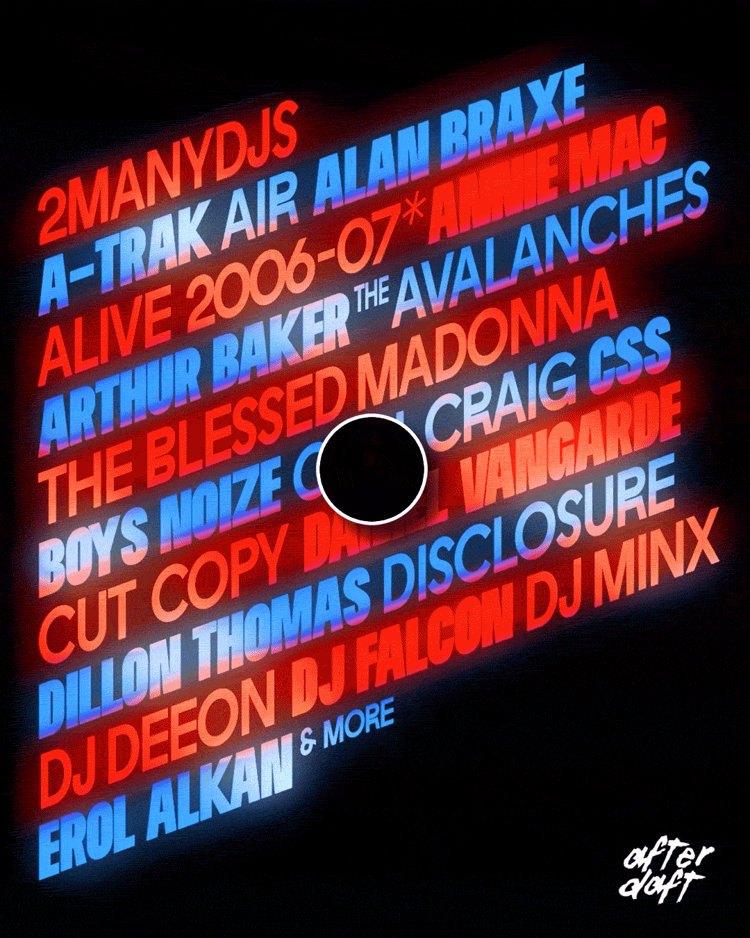 Design and sound design for a series of digital announcements for music writer / journalist Gabriel Szatan’s upcoming book, entitled After Daft. The book documents and compiles the rise of Daft Punk and their huge influence on electronic music. The book contains a vast range of interviews with artists and people working in the industry so the announcements served to list the contributors en-masse, much like a festival line-up.